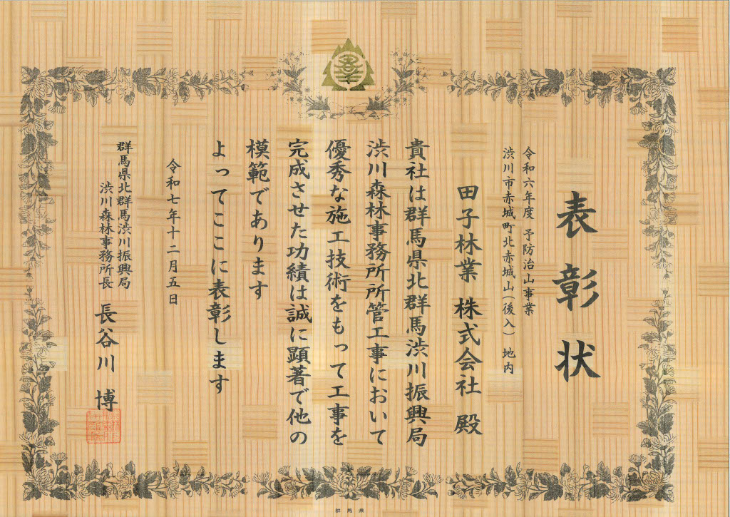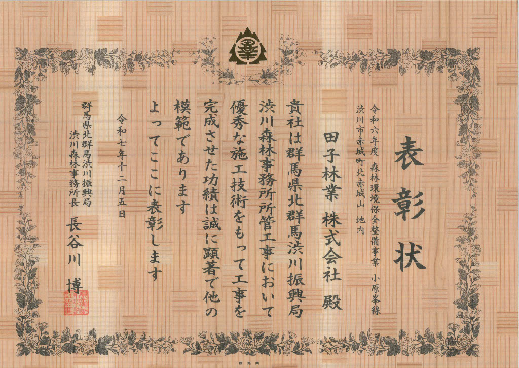 令和7年度 渋川森林事務所長表彰受賞2025-12-05 弊社で施工しました工事現場にて所長表彰を受賞いたしました。当該工事に携わっていただいた関係各所の皆様、この度は大変ありがとうございました。 より一層品質の高い工事施工を目指してまいりますので、今後ともよろしくお願いいたします。